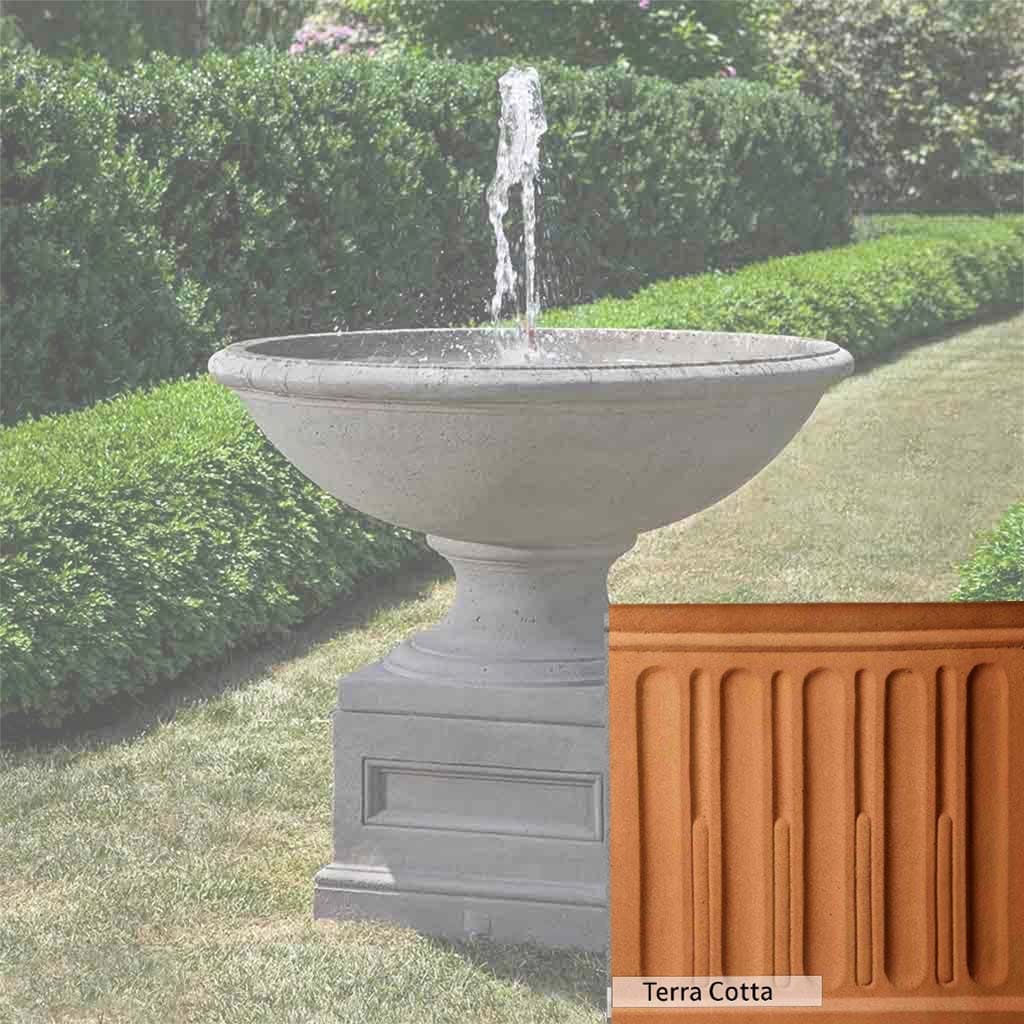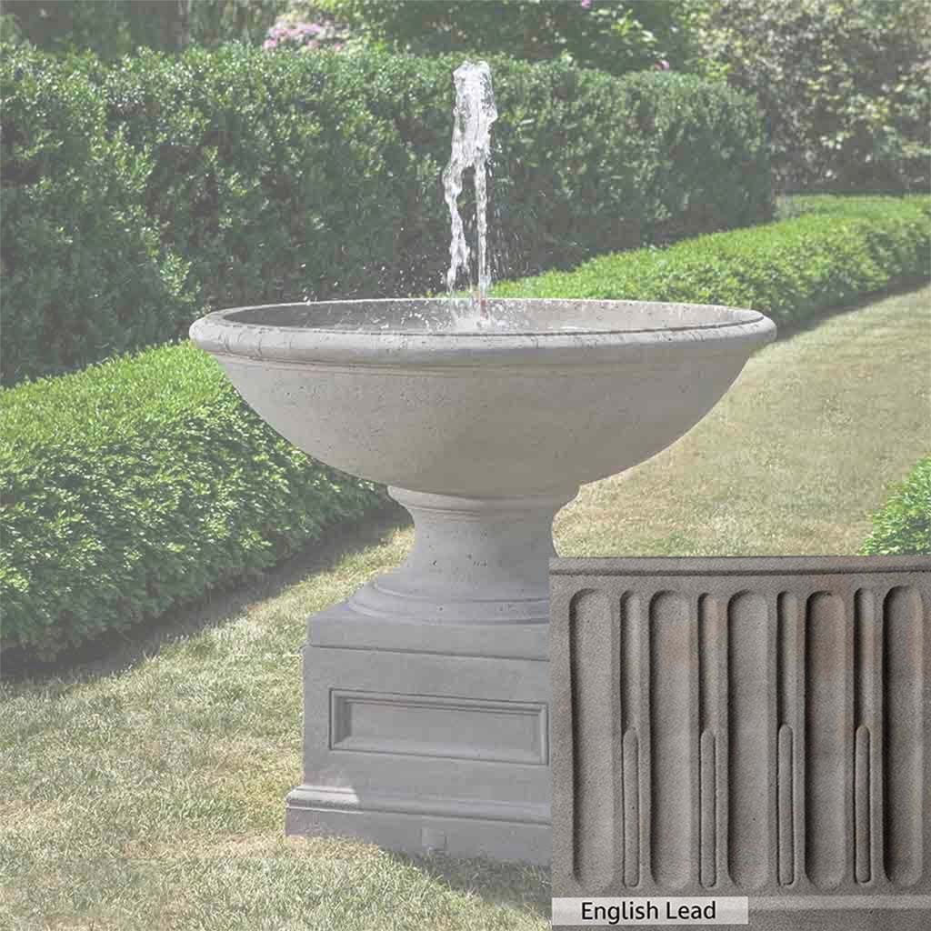 The Condotti Fountain is handcrafted by skilled artisans in the USA. With their extensive experience, the Campania team applies a unique patina to ensure that each piece is special. This fountain is shown in the Alpine Stone color. Campania International's proprietary cast stone blend is meticulously molded to create each piece used in the construction of this fountain. Due to the use of different materials and manufacturing processes, as well as varying photography conditions, natural variations in size, weight, and color can occur. The actual color may differ from the photo.