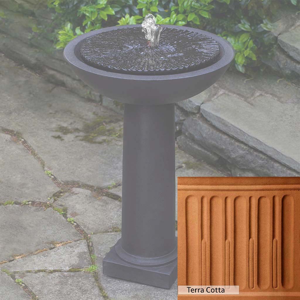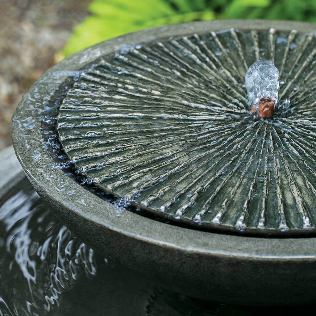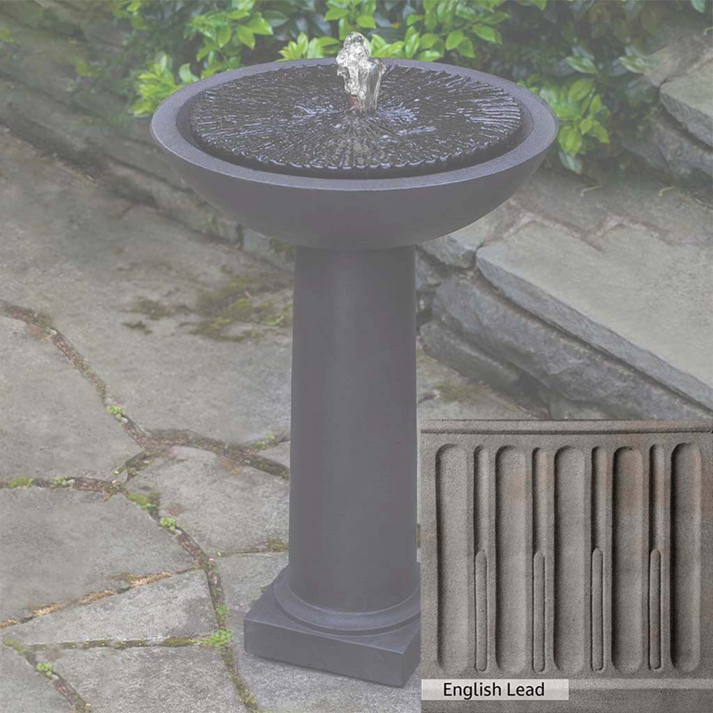 The Equinox Birdbath Fountain is handcrafted by skilled artisans in the USA. The Campania team applies a unique patina with experienced hands, making each piece special. This fountain is featured in the Nero Nuovo color. Campania International's exclusive cast stone blend is expertly molded to create each piece in the construction of this fountain. Due to the materials used and manufacturing processes, as well as variations in photography conditions, natural differences may occur in size, weight, and color. The actual color may vary from the photo.
